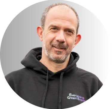Chris, founder of Everything Green Energy started his career in construction with various roles including playgrounds, housing developments and commercial. He has an MSc in Civil Engineering from Southampton University and is a member of the IET (MIET). He's also a qualified electrician. Chris will be found on roofs and in vans getting supplies, organising stuff and making tea. He is also a keen cyclist.